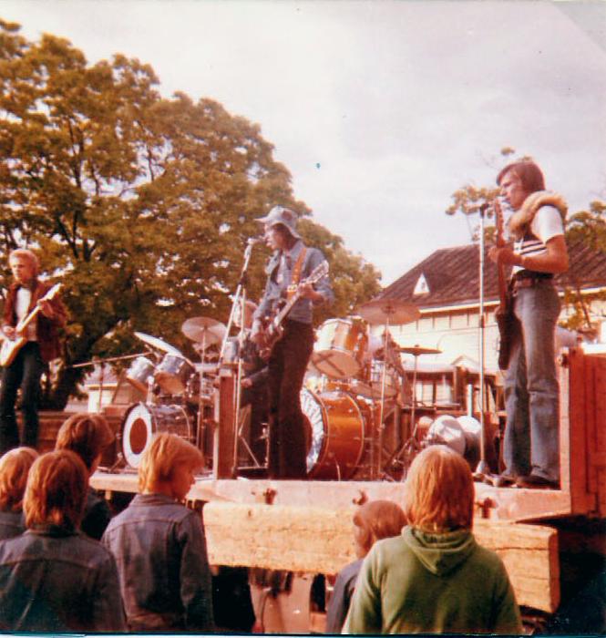 Vi spelade i början på fester och danser, främst i Borgåtrakten. Ställen som Sannäs, Magnusborg och Svenskborg blev bekanta. Här till vänster en bild från Borgågården där vi spelade på ett lastbilsflak.
